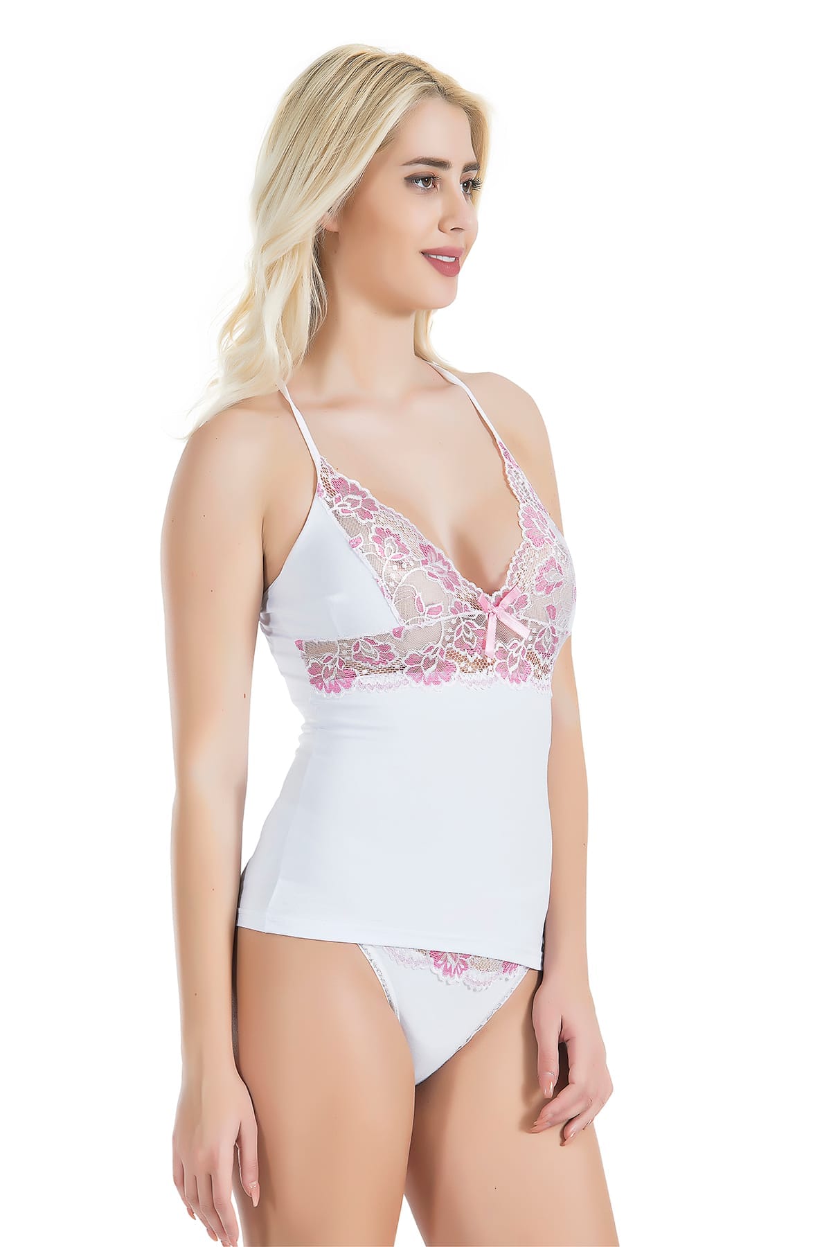 Sırt kısmından çapraz askılı yeni sezon güpür dantel işlemeli atlet külot takım modelidir.