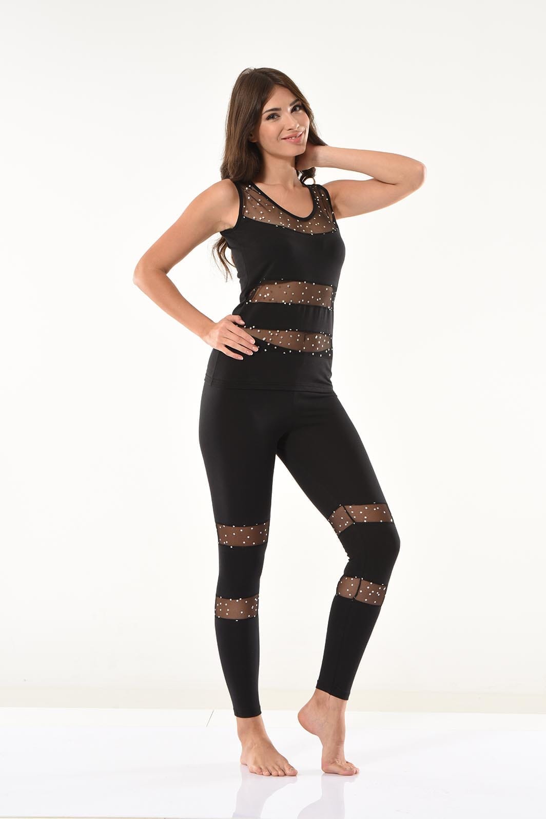 Transparan detaylı ve puantiyeli yeni sezon modelli kadın tayt takım modelidir.